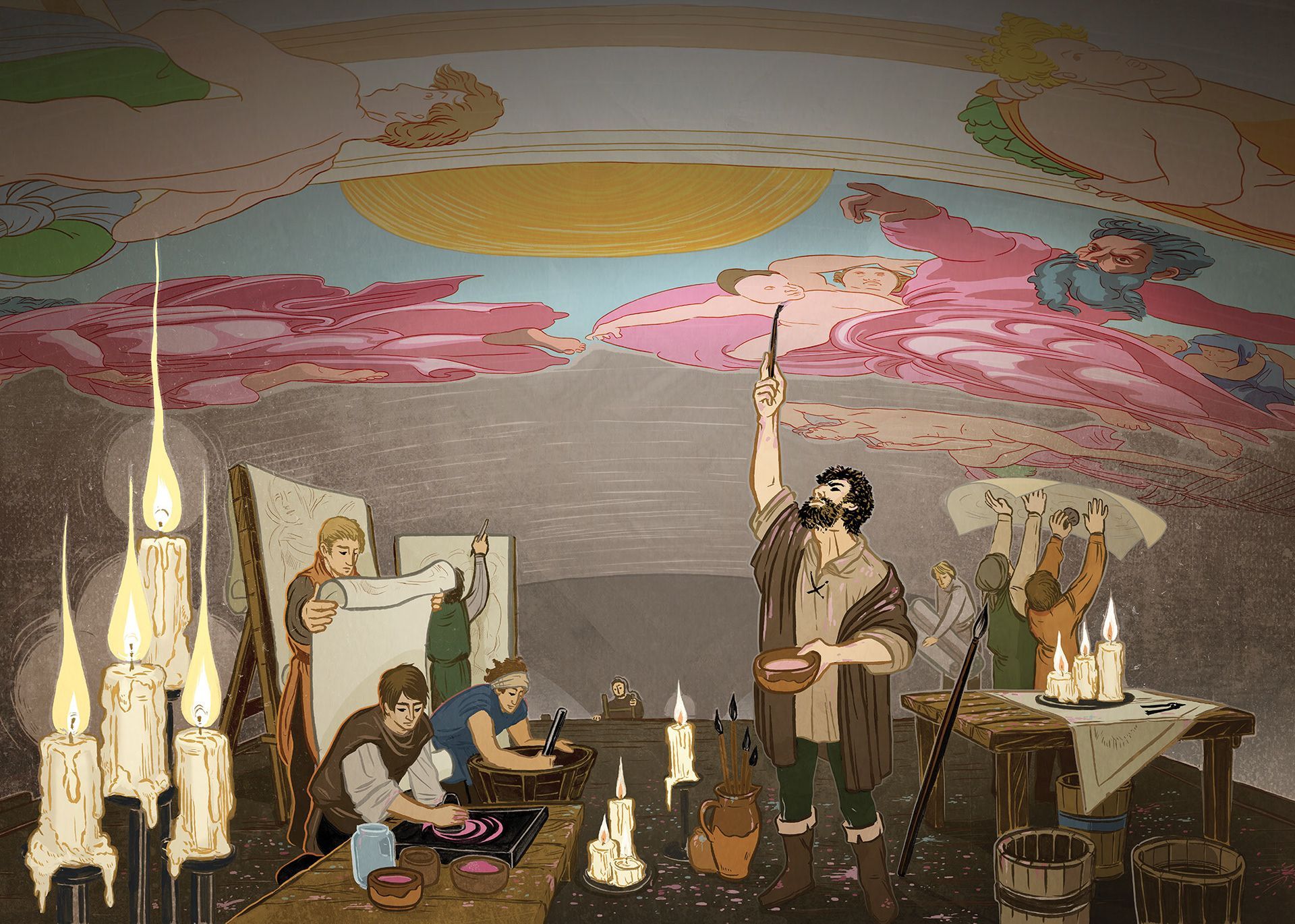 One of our favorite illustrations shows him standing alone before the vast, empty surface of the Last Judgment. Though the wall is still blank, Michelangelo already envisions the figures that will soon fill it. His imagination projects itself onto the white surface, driven not only by natural talent but also by determination and relentless effort.